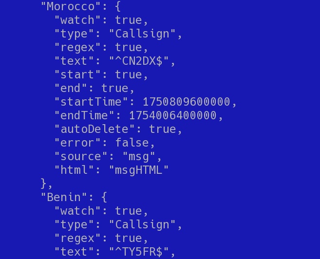 The data are converted to Watchers for GridTracker2. There are four files. In DX Watchers 1 and 2 the message in the Message field is highlighted, when the regex matches. In DX Watchers 3 and 4 the callsign in the Callsign field is highlighted. The files are either for all announced DX Operations or only for the currently active ones.